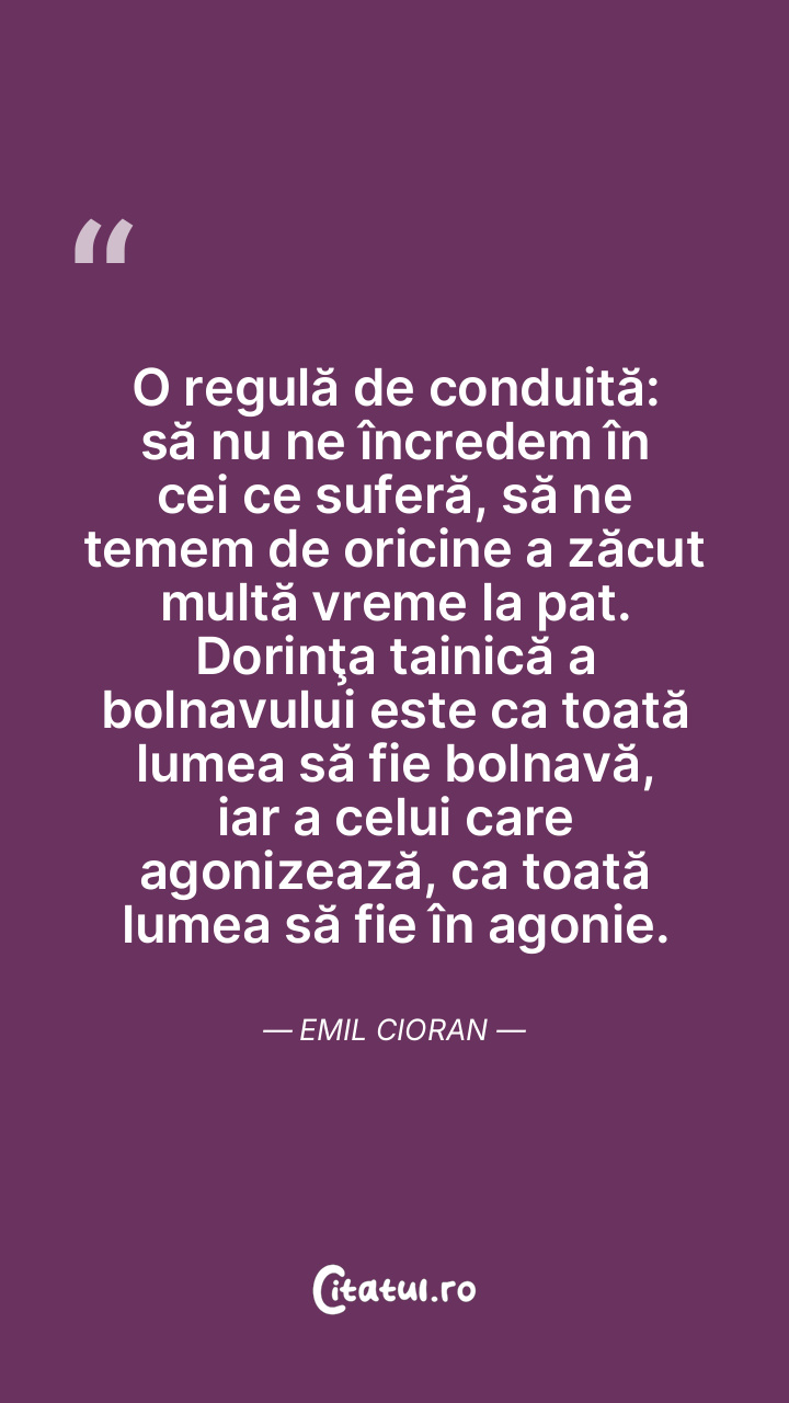 O regulă de conduită: să nu ne încredem în cei ce suferă, să ne temem de oricine a zăcut multă vreme la pat. Dorinţa tainică a bolnavului este ca toată lumea să fie bolnavă, iar a celui care agonizează, ca toată lumea să fie în agonie. Emil Cioran