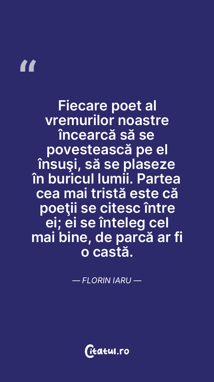 Fiecare poet al vremurilor noastre încearcă să se povestească pe el însuşi, să se plaseze în buricul lumii. Partea cea mai tristă este că poeţii se citesc între ei; ei se înteleg cel mai bine, de parcă ar fi o castă. Florin Iaru