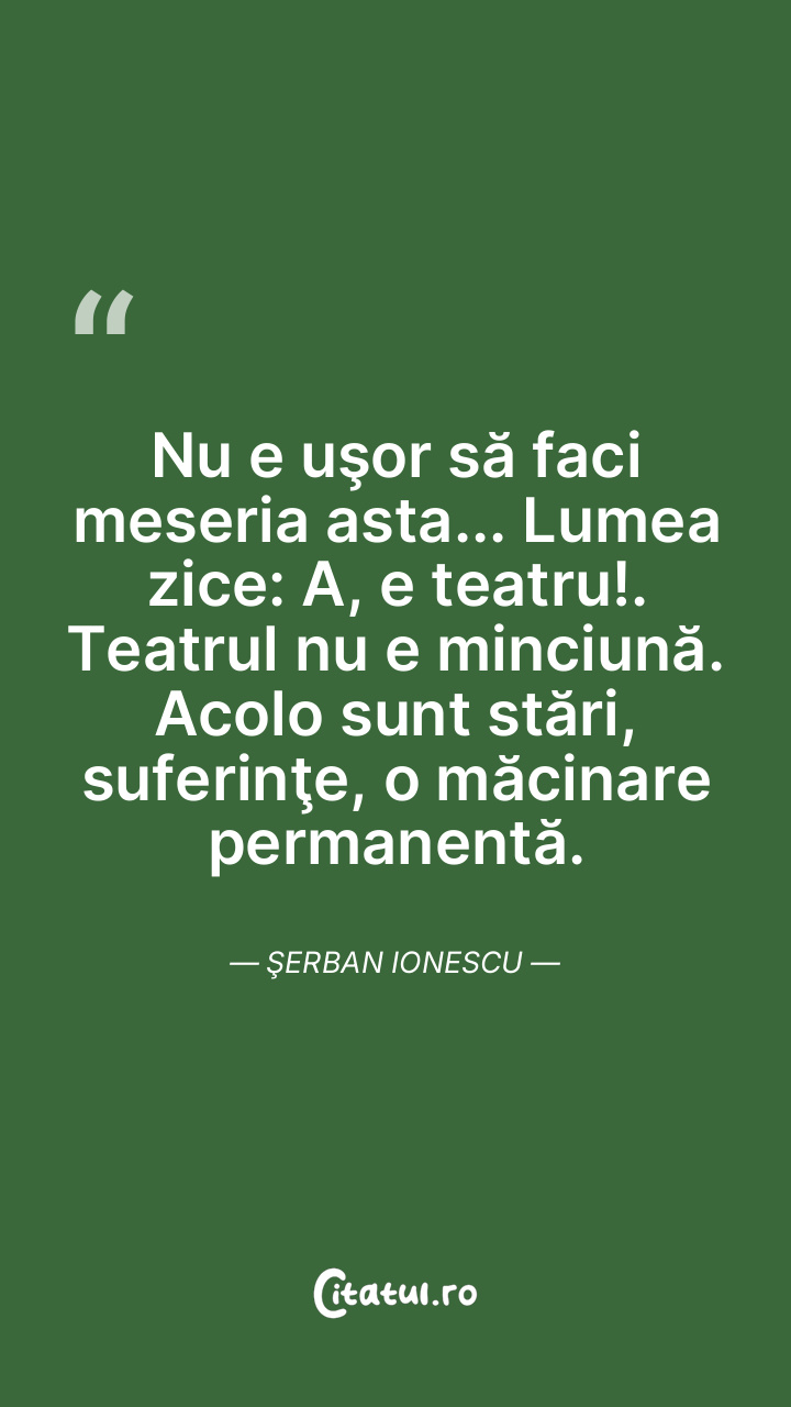 Nu e uşor să faci meseria asta... Lumea zice: A, e teatru!. Teatrul nu e minciună. Acolo sunt stări, suferinţe, o măcinare permanentă. Şerban Ionescu