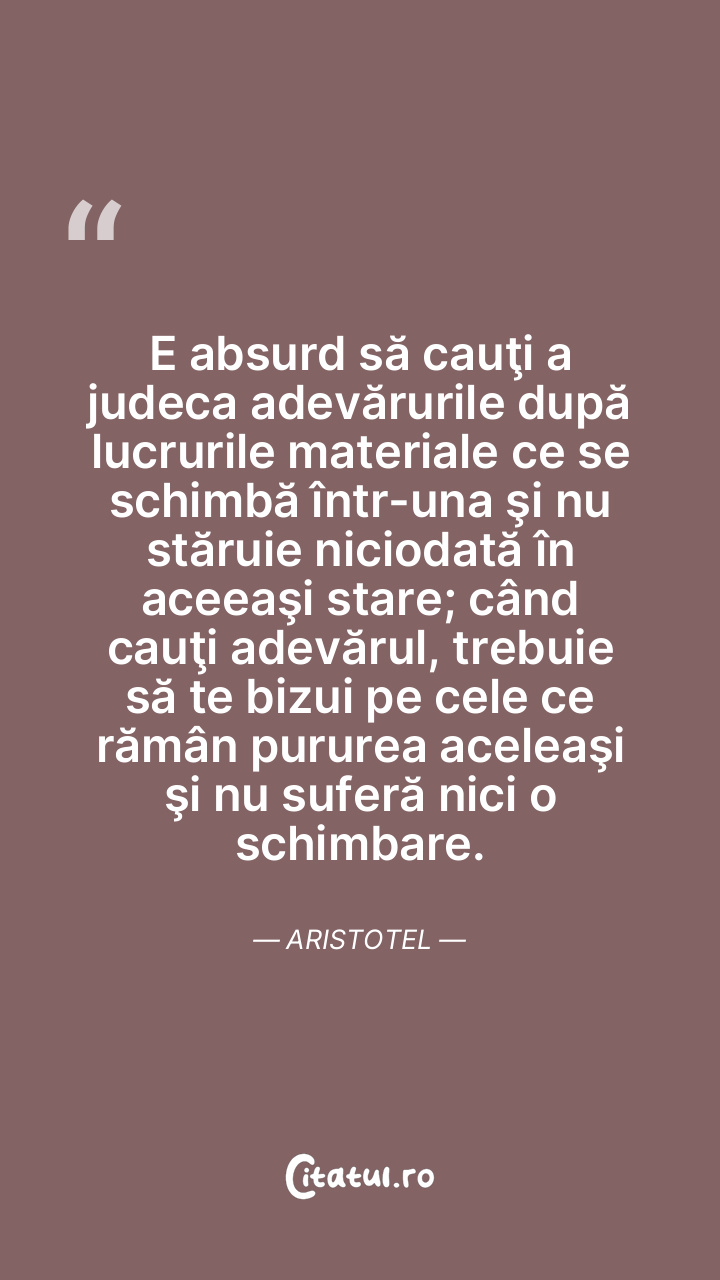 E absurd să cauţi a judeca adevărurile după lucrurile materiale ce se schimbă într-una şi nu stăruie niciodată în aceeaşi stare; când cauţi adevărul, trebuie să te bizui pe cele ce rămân pururea aceleaşi şi nu suferă nici o schimbare. Aristotel