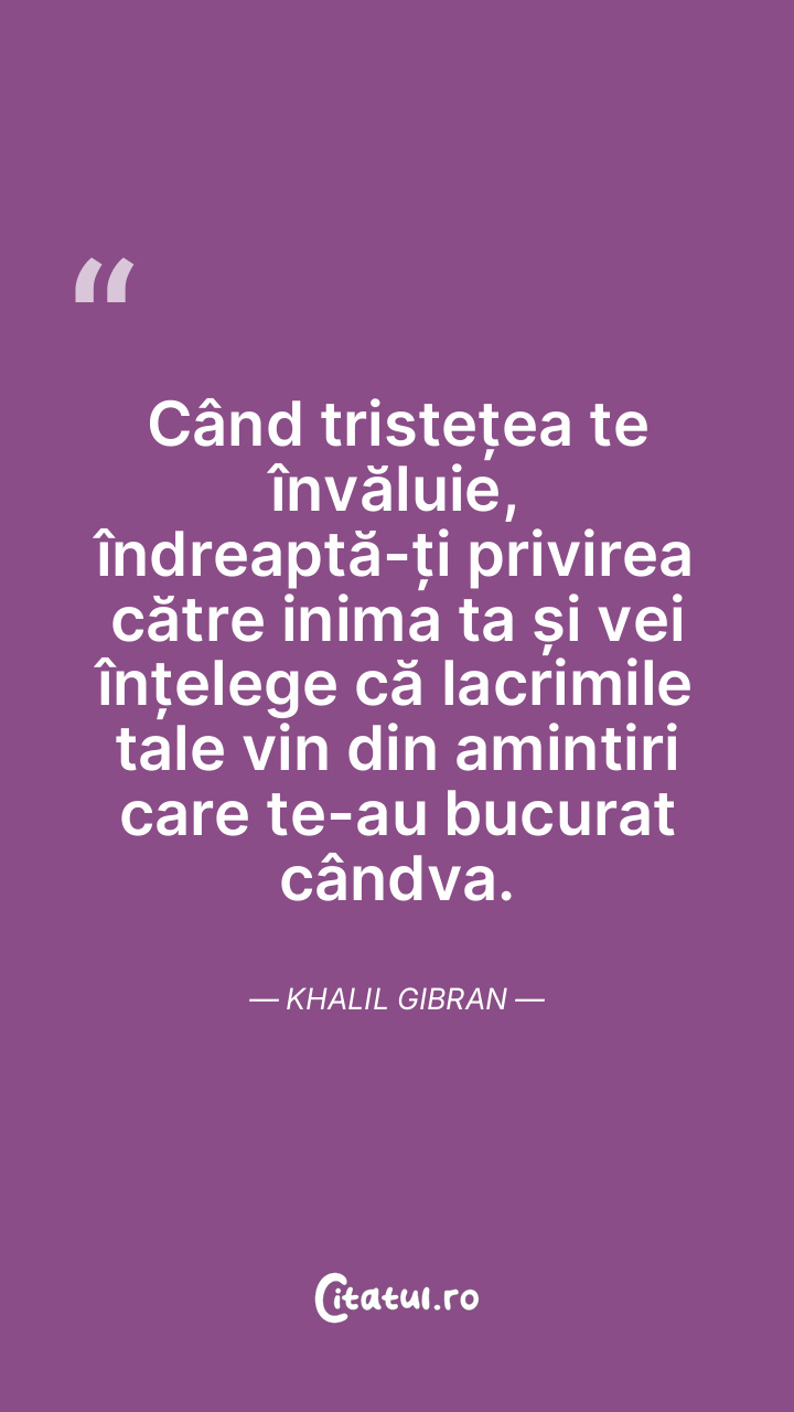 Când tristețea te învăluie, îndreaptă-ți privirea către inima ta și vei înțelege că lacrimile tale vin din amintiri care te-au bucurat cândva. Khalil Gibran