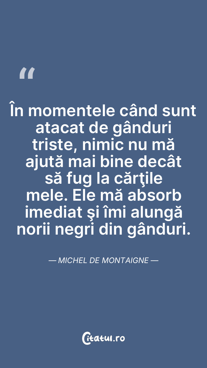 În momentele când sunt atacat de gânduri triste, nimic nu mă ajută mai bine decât să fug la cărţile mele. Ele mă absorb imediat şi îmi alungă norii negri din gânduri. Michel de Montaigne