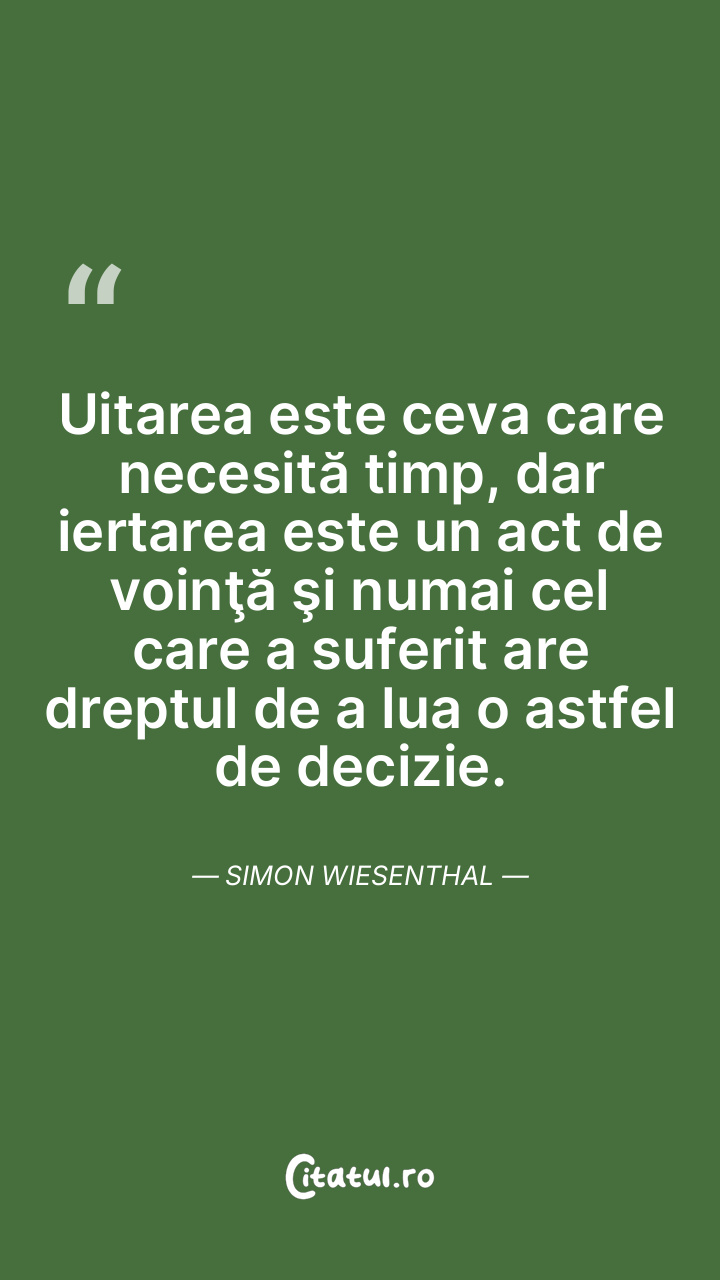 Uitarea este ceva care necesită timp, dar iertarea este un act de voinţă şi numai cel care a suferit are dreptul de a lua o astfel de decizie. Simon Wiesenthal
