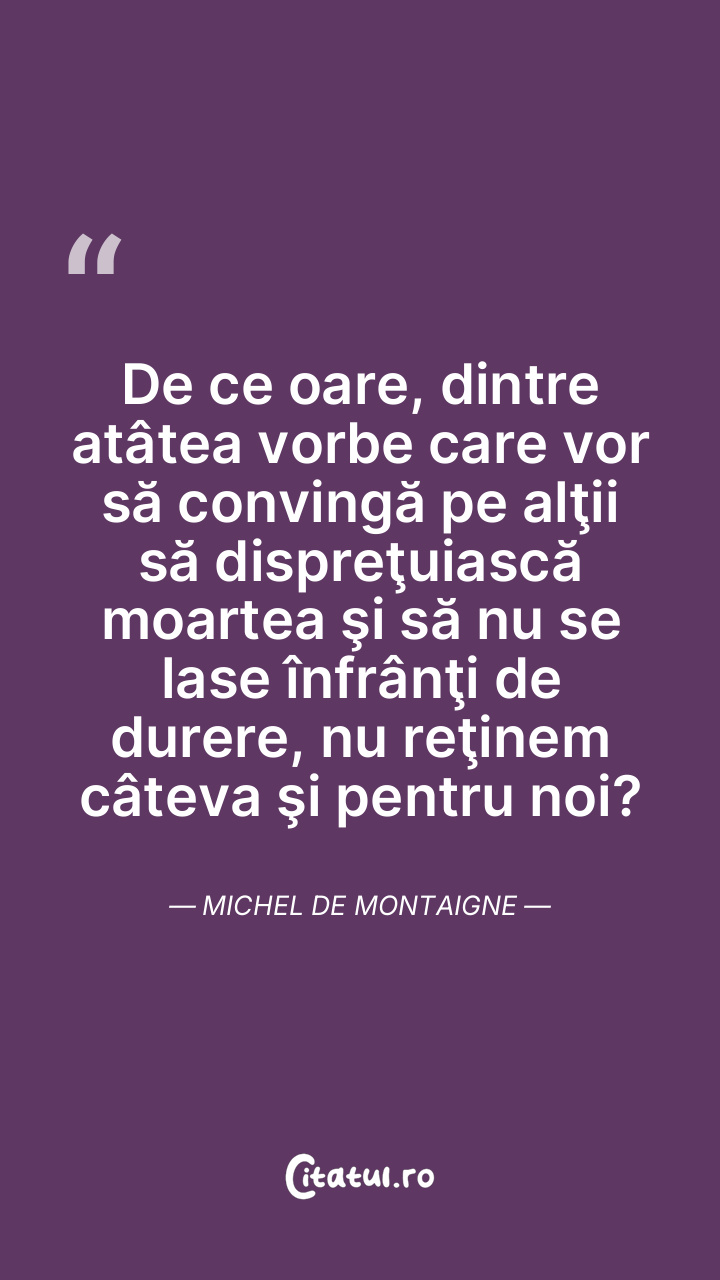 De ce oare, dintre atâtea vorbe care vor să convingă pe alţii să dispreţuiască moartea şi să nu se lase înfrânţi de durere, nu reţinem câteva şi pentru noi? Michel de Montaigne
