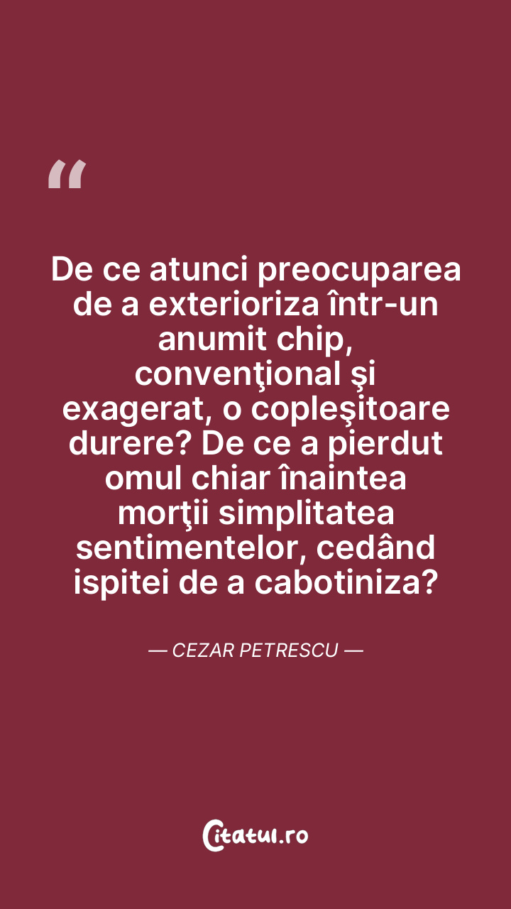 De ce atunci preocuparea de a exterioriza într-un anumit chip, convenţional şi exagerat, o copleşitoare durere? De ce a pierdut omul chiar înaintea morţii simplitatea sentimentelor, cedând ispitei de a cabotiniza? Cezar Petrescu
