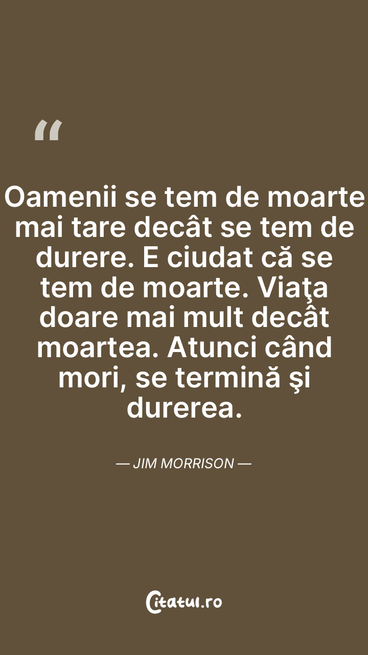 Oamenii se tem de moarte mai tare decât se tem de durere. E ciudat că se tem de moarte. Viaţa doare mai mult decât moartea. Atunci când mori, se termină şi durerea. Jim Morrison