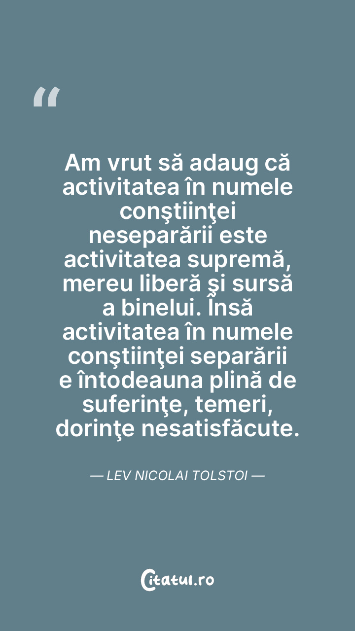 Am vrut să adaug că activitatea în numele conştiinţei neseparării este activitatea supremă, mereu liberă şi sursă a binelui. Însă activitatea în numele conştiinţei separării e întodeauna plină de suferinţe, temeri, dorinţe nesatisfăcute. Lev Nicolai Tolstoi