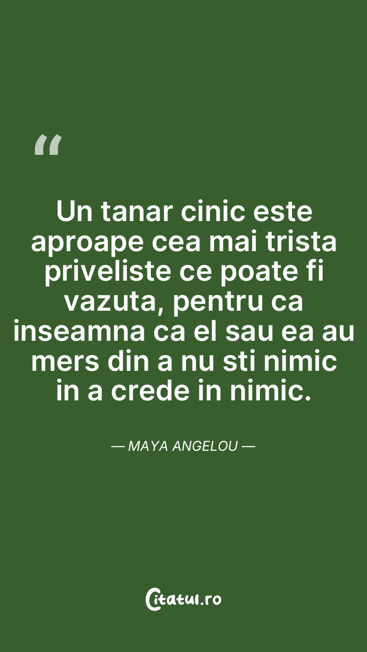 Un tanar cinic este aproape cea mai trista priveliste ce poate fi vazuta, pentru ca inseamna ca el sau ea au mers din a nu sti nimic in a crede in nimic. Maya Angelou
