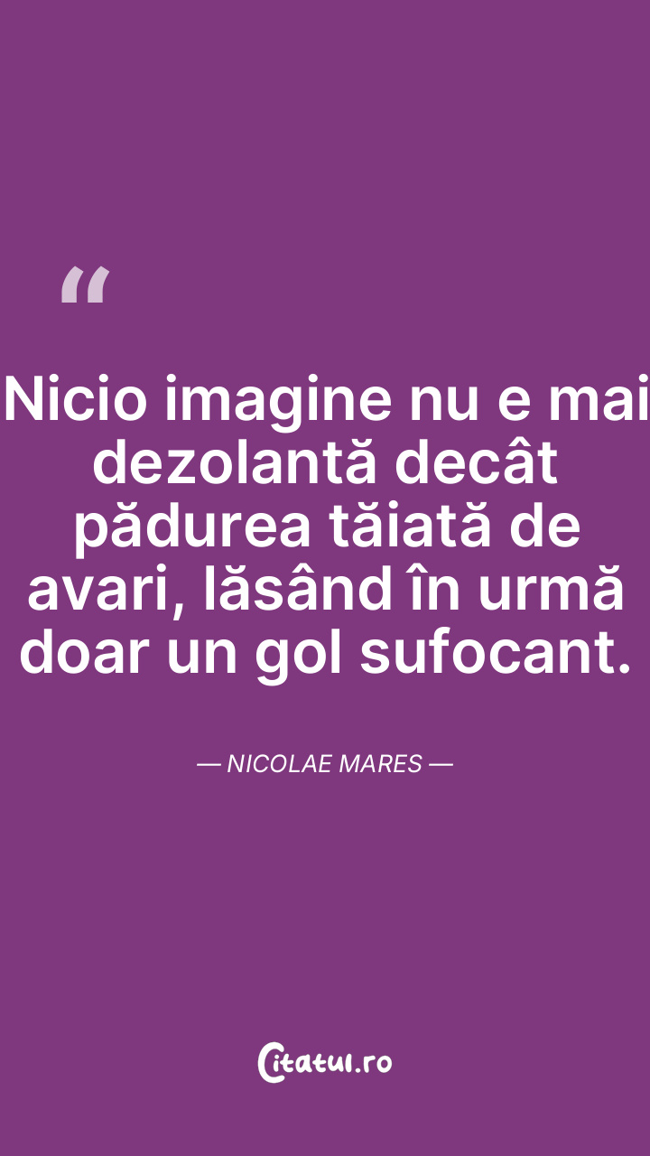 Nicio imagine nu e mai dezolantă decât pădurea tăiată de avari, lăsând în urmă doar un gol sufocant. Nicolae Mares