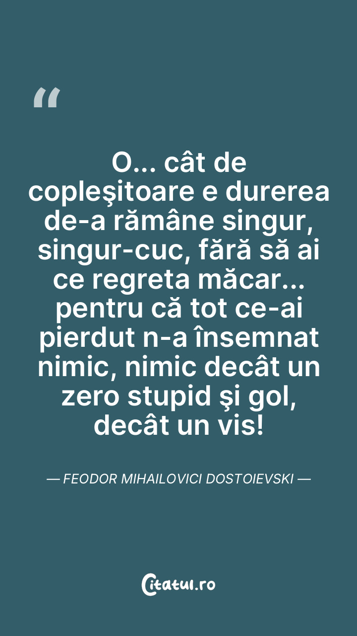 O... cât de copleşitoare e durerea de-a rămâne singur, singur-cuc, fără să ai ce regreta măcar... pentru că tot ce-ai pierdut n-a însemnat nimic, nimic decât un zero stupid şi gol, decât un vis! Feodor Mihailovici Dostoievski