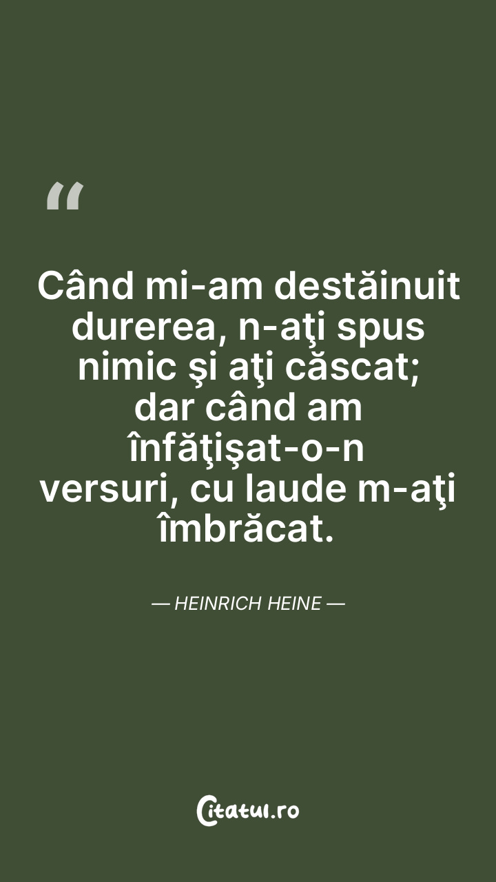 Când mi-am destăinuit durerea, n-aţi spus nimic şi aţi căscat; dar când am înfăţişat-o-n versuri, cu laude m-aţi îmbrăcat. Heinrich Heine