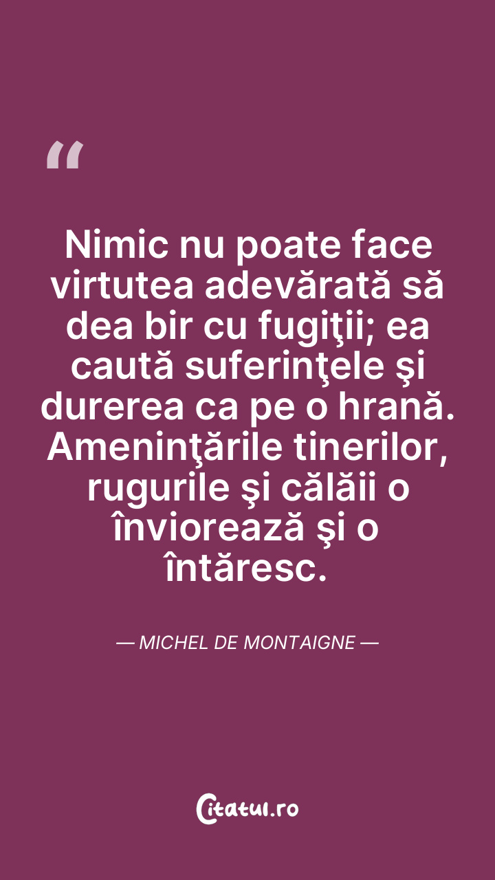 Nimic nu poate face virtutea adevărată să dea bir cu fugiţii; ea caută suferinţele şi durerea ca pe o hrană. Ameninţările tinerilor, rugurile şi călăii o înviorează şi o întăresc. Michel de Montaigne