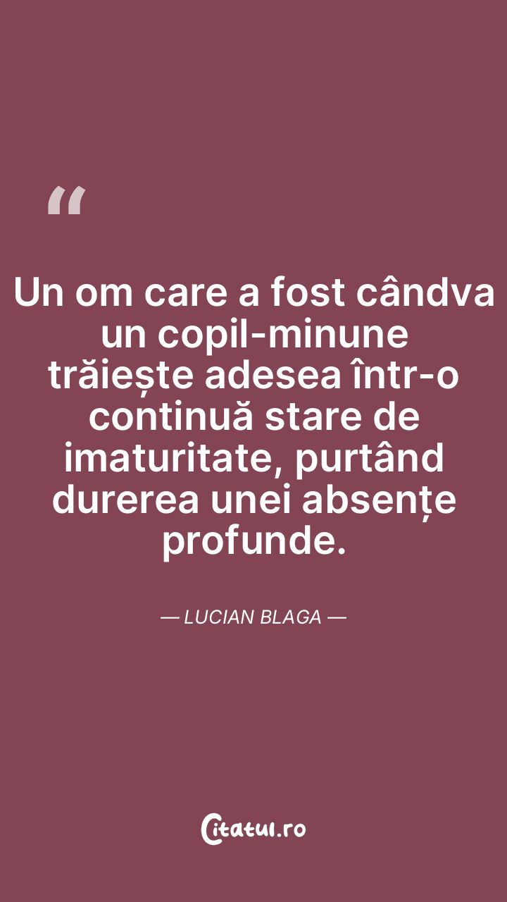 Un om care a fost cândva un copil-minune trăiește adesea într-o continuă stare de imaturitate, purtând durerea unei absențe profunde. Lucian Blaga