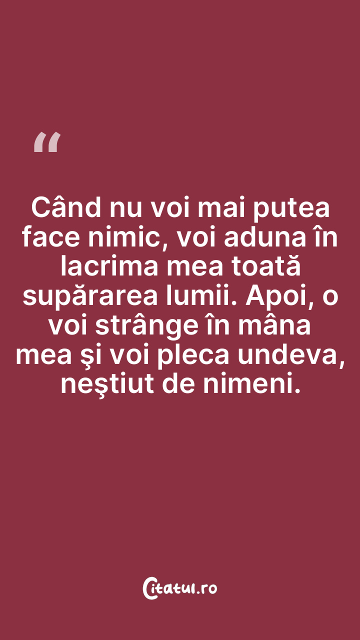 Când nu voi mai putea face nimic, voi aduna în lacrima mea toată supărarea lumii. Apoi, o voi strânge în mâna mea şi voi pleca undeva, neştiut de nimeni.