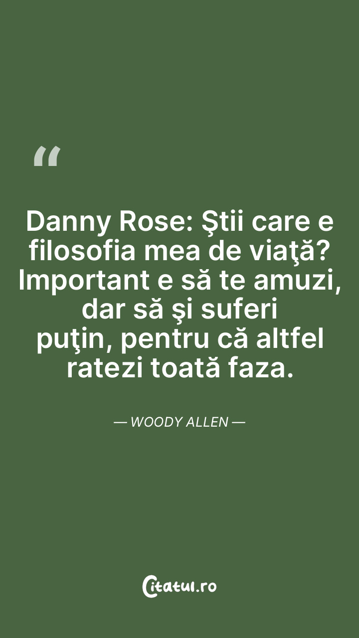 Danny Rose: Ştii care e filosofia mea de viaţă? Important e să te amuzi, dar să şi suferi puţin, pentru că altfel ratezi toată faza. Woody Allen