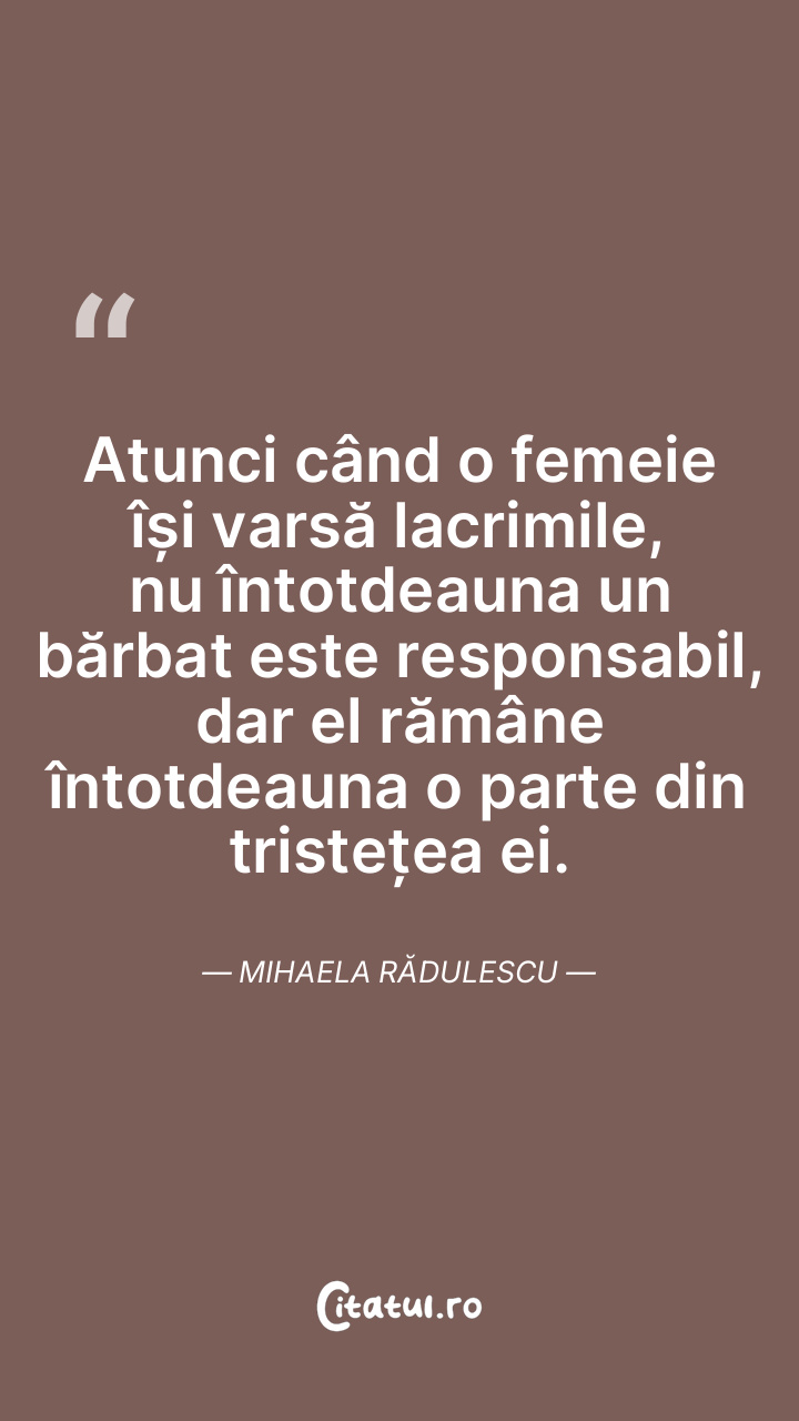 Atunci când o femeie își varsă lacrimile, nu întotdeauna un bărbat este responsabil, dar el rămâne întotdeauna o parte din tristețea ei. Mihaela Rădulescu