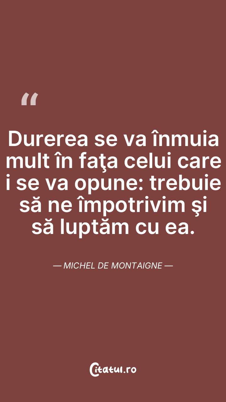 Durerea se va înmuia mult în faţa celui care i se va opune: trebuie să ne împotrivim şi să luptăm cu ea. Michel de Montaigne