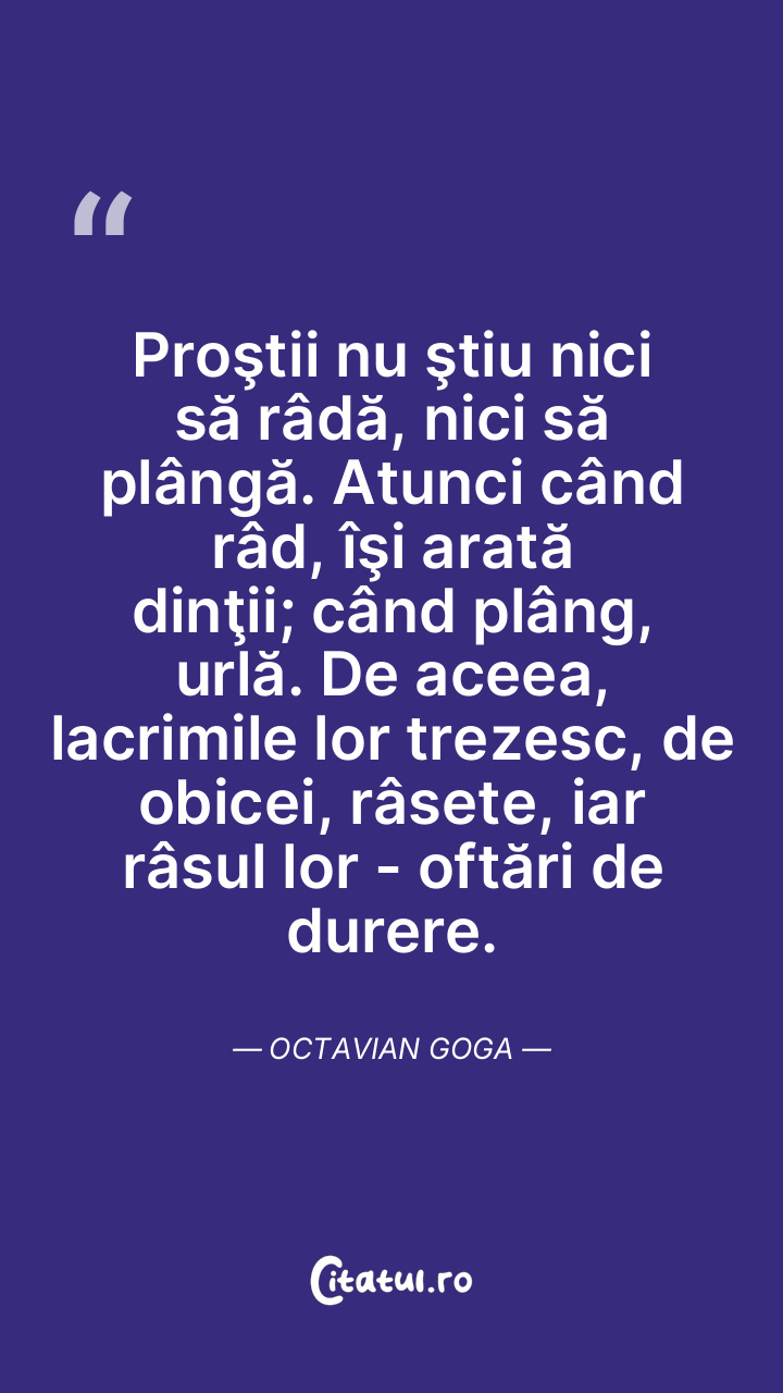 Proştii nu ştiu nici să râdă, nici să plângă. Atunci când râd, îşi arată dinţii; când plâng, urlă. De aceea, lacrimile lor trezesc, de obicei, râsete, iar râsul lor - oftări de durere. Octavian Goga