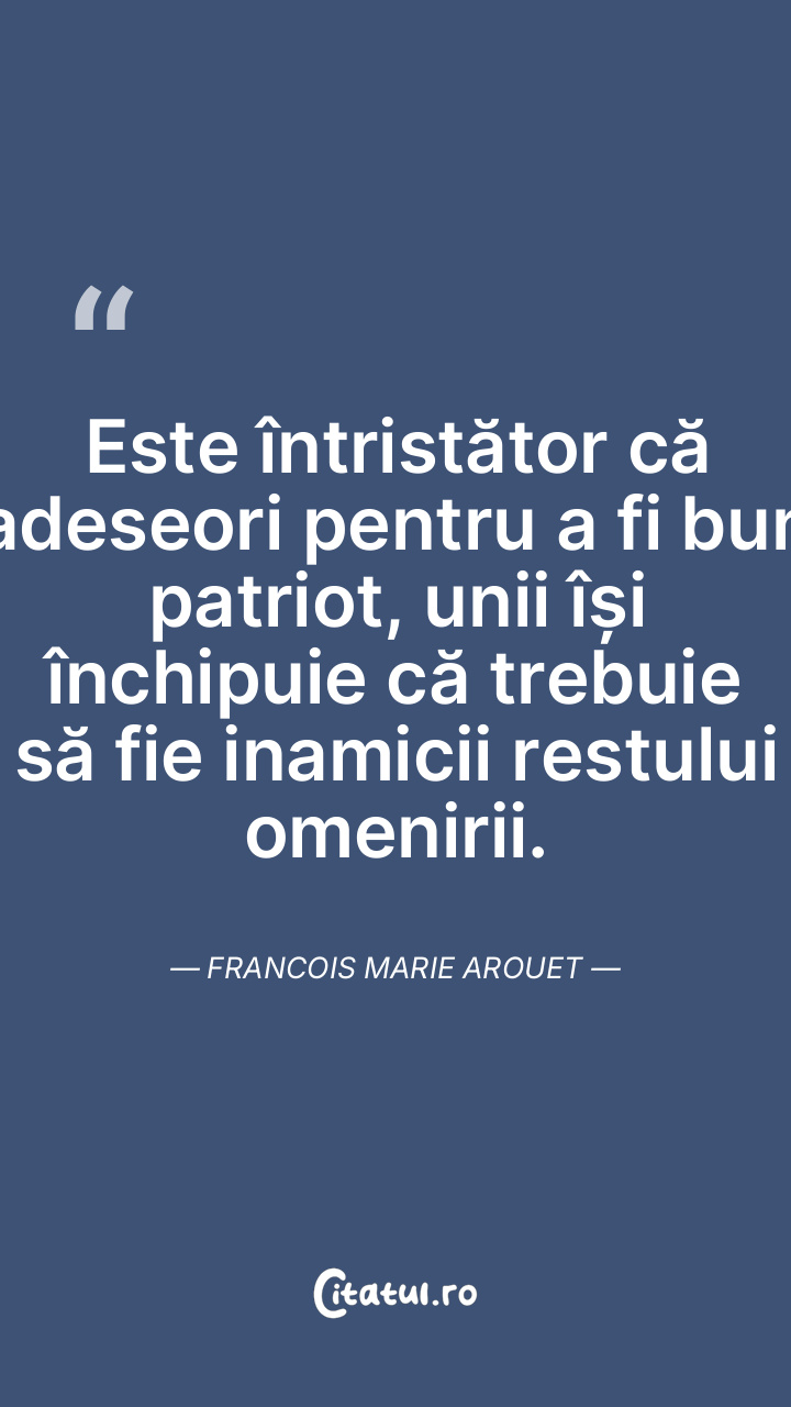 Este întristător că adeseori pentru a fi bun patriot, unii își închipuie că trebuie să fie inamicii restului omenirii. Francois Marie Arouet