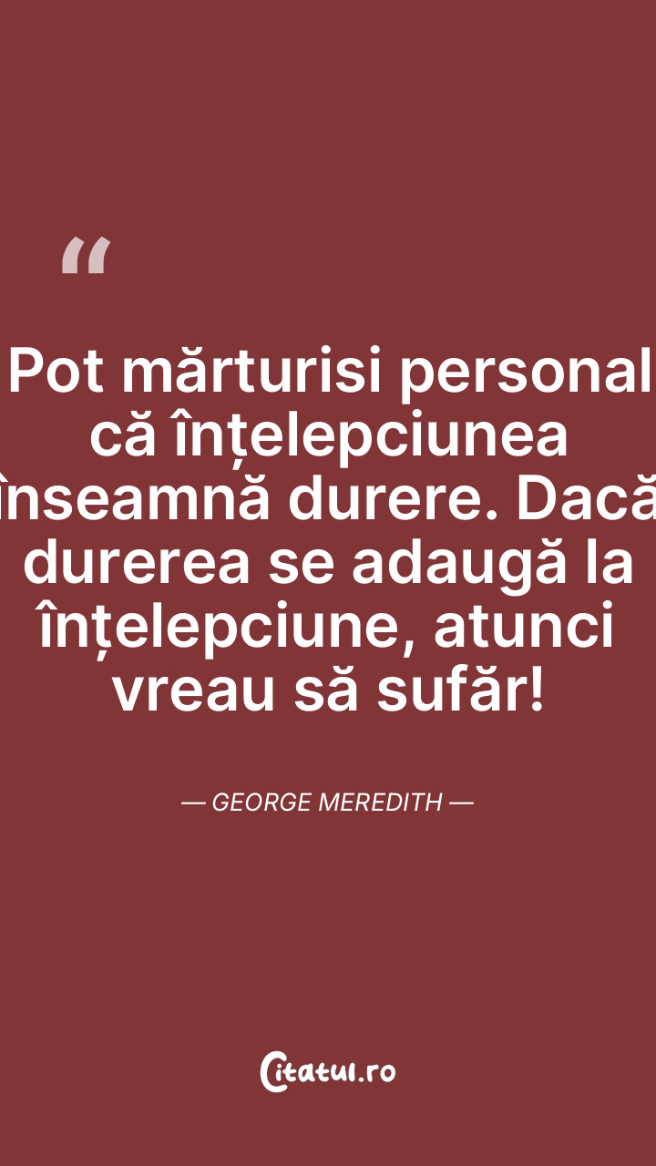 Pot mărturisi personal că înțelepciunea înseamnă durere. Dacă durerea se adaugă la înțelepciune, atunci vreau să sufăr! George Meredith