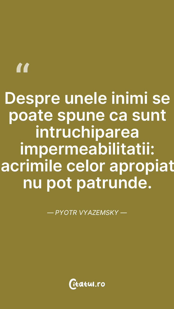 Despre unele inimi se poate spune ca sunt intruchiparea impermeabilitatii: lacrimile celor apropiati nu pot patrunde. Pyotr Vyazemsky