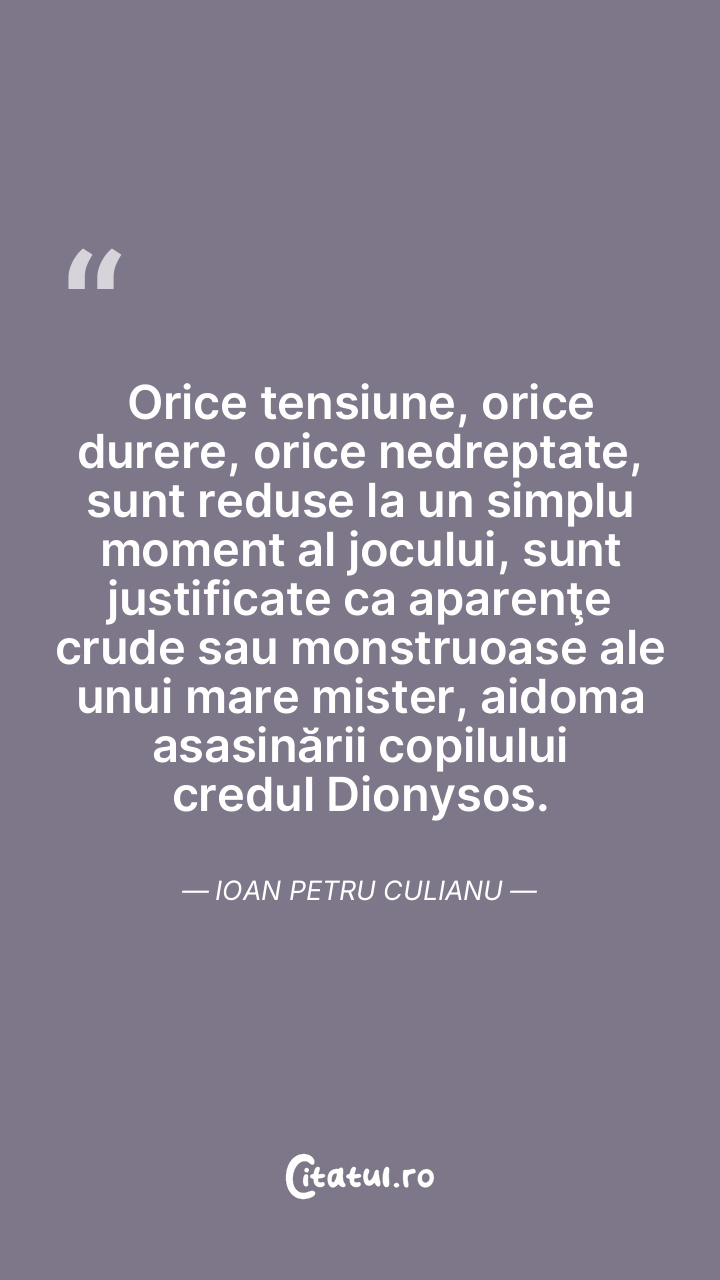 Orice tensiune, orice durere, orice nedreptate, sunt reduse la un simplu moment al jocului, sunt justificate ca aparenţe crude sau monstruoase ale unui mare mister, aidoma asasinării copilului credul Dionysos. Ioan Petru Culianu