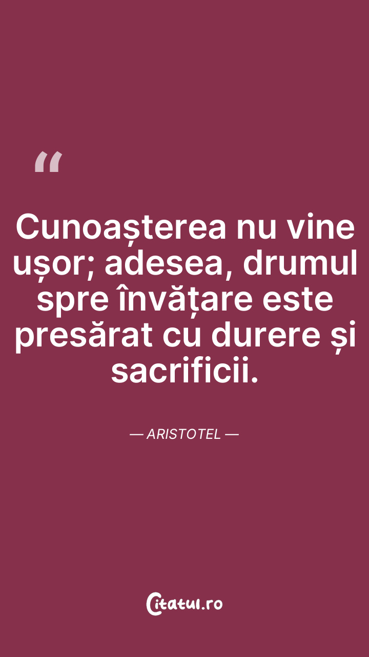 Cunoașterea nu vine ușor; adesea, drumul spre învățare este presărat cu durere și sacrificii. Aristotel