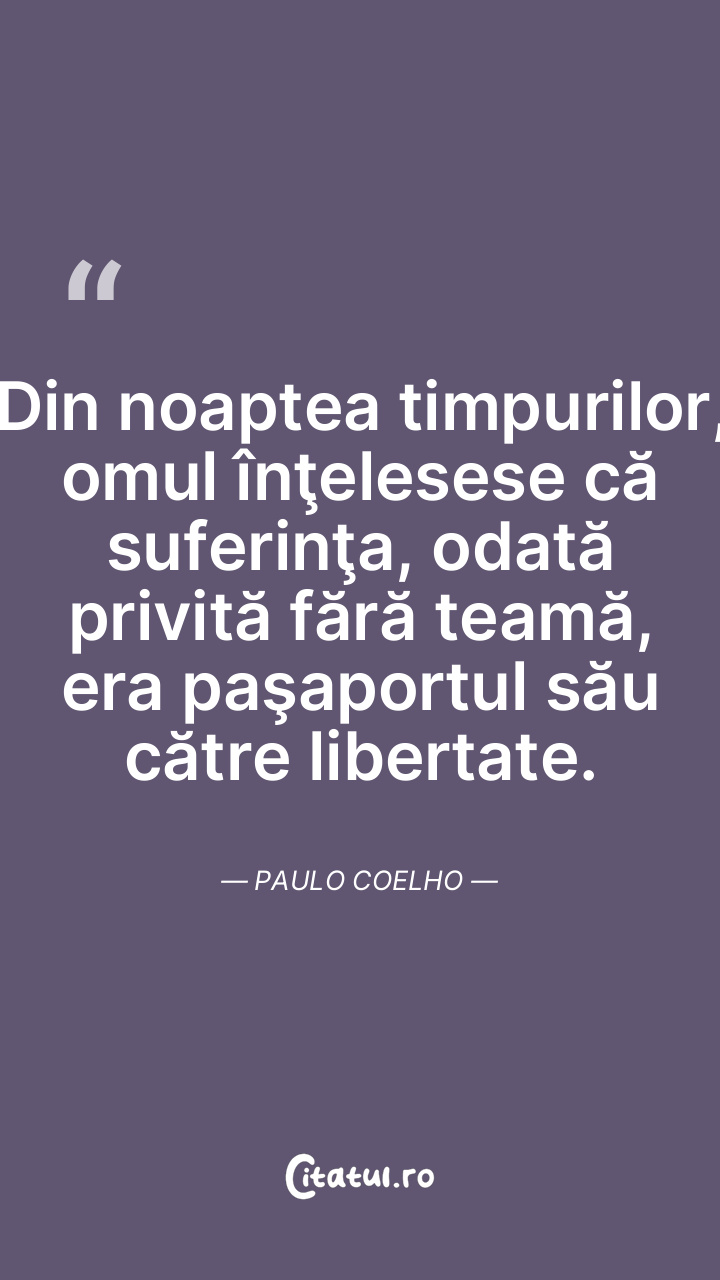 Din noaptea timpurilor, omul înţelesese că suferinţa, odată privită fără teamă, era paşaportul său către libertate. Paulo Coelho