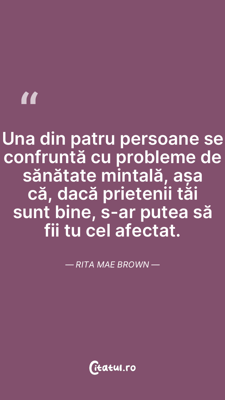 Una din patru persoane se confruntă cu probleme de sănătate mintală, așa că, dacă prietenii tăi sunt bine, s-ar putea să fii tu cel afectat. Rita Mae Brown