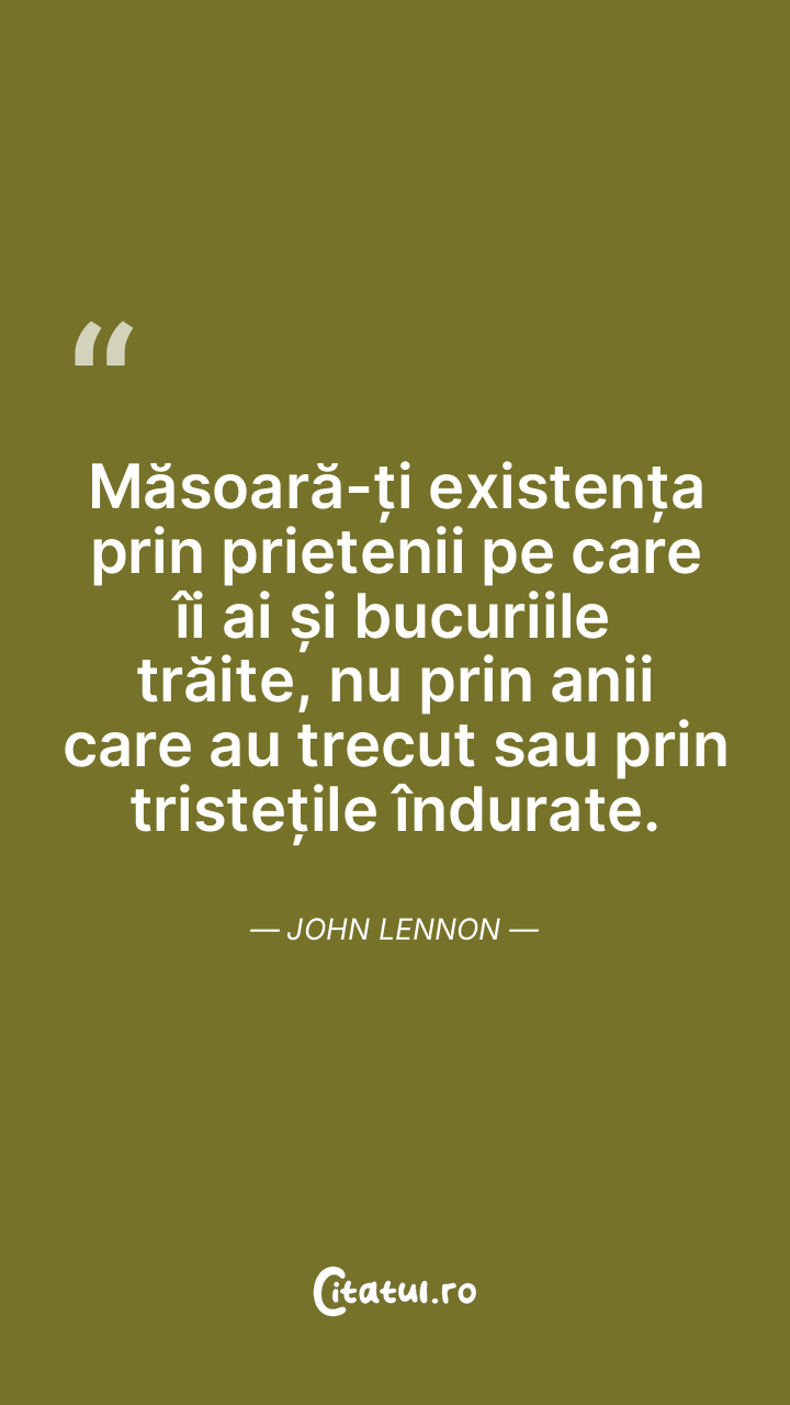 Măsoară-ți existența prin prietenii pe care îi ai și bucuriile trăite, nu prin anii care au trecut sau prin tristețile îndurate. John Lennon