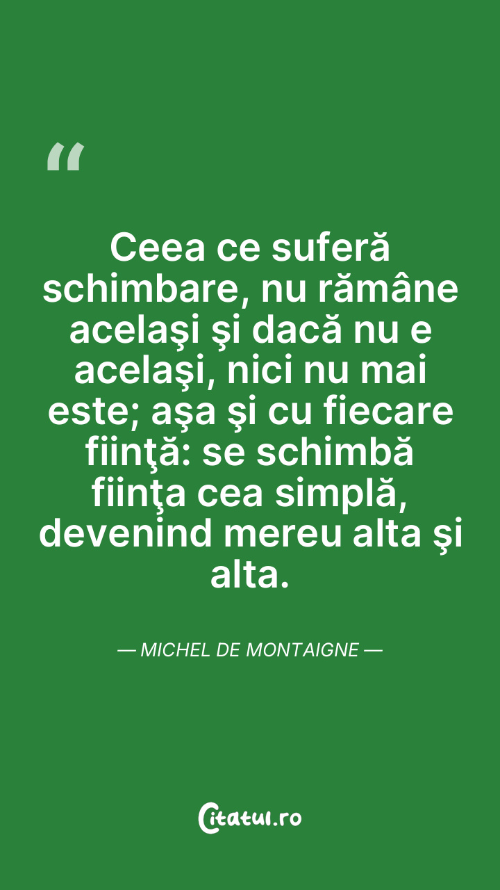 Ceea ce suferă schimbare, nu rămâne acelaşi şi dacă nu e acelaşi, nici nu mai este; aşa şi cu fiecare fiinţă: se schimbă fiinţa cea simplă, devenind mereu alta şi alta. Michel de Montaigne