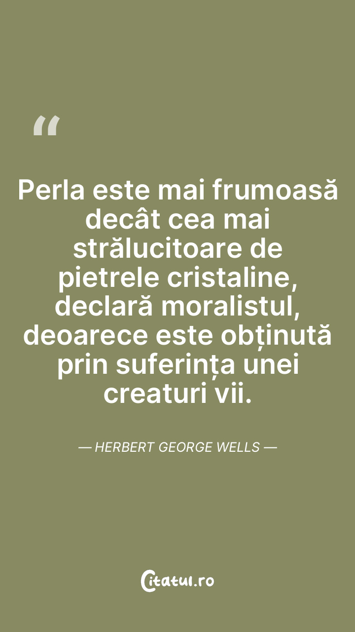 Perla este mai frumoasă decât cea mai strălucitoare de pietrele cristaline, declară moralistul, deoarece este obținută prin suferința unei creaturi vii. Herbert George Wells