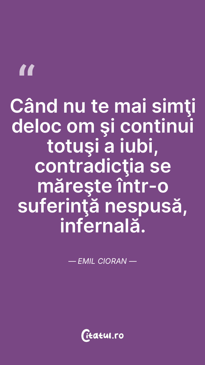 Când nu te mai simţi deloc om şi continui totuşi a iubi, contradicţia se măreşte într-o suferinţă nespusă, infernală. Emil Cioran