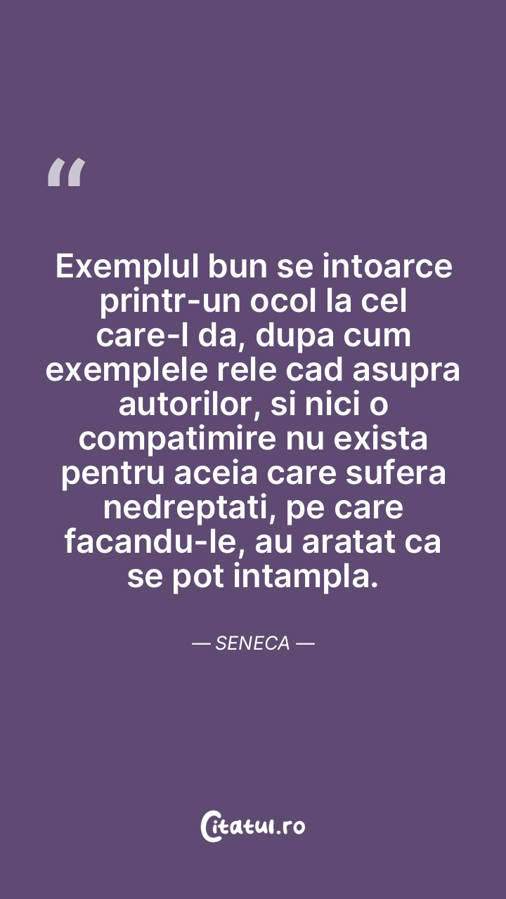 Exemplul bun se intoarce printr-un ocol la cel care-l da, dupa cum exemplele rele cad asupra autorilor, si nici o compatimire nu exista pentru aceia care sufera nedreptati, pe care facandu-le, au aratat ca se pot intampla. Seneca