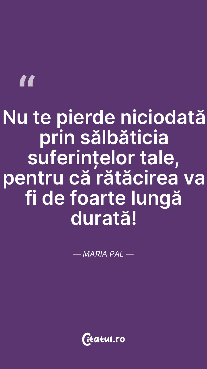 Nu te pierde niciodată prin sălbăticia suferințelor tale, pentru că rătăcirea va fi de foarte lungă durată! Maria Pal