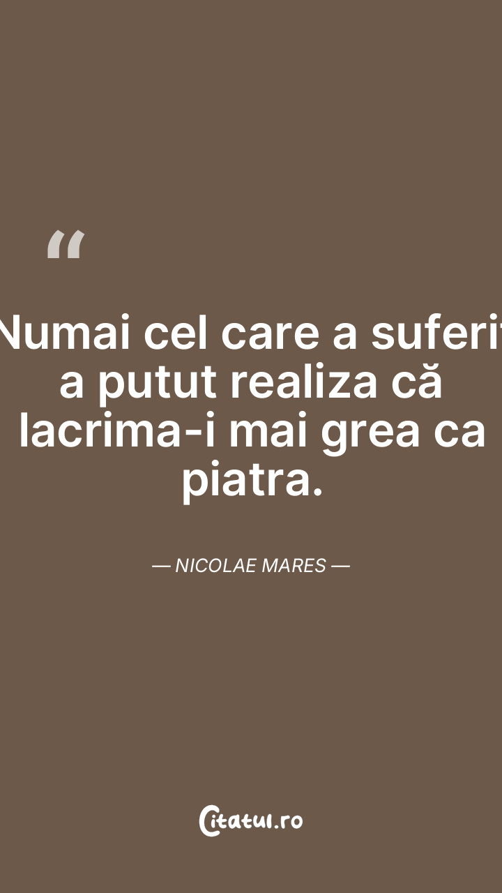 Numai cel care a suferit a putut realiza că lacrima-i mai grea ca piatra. Nicolae Mares
