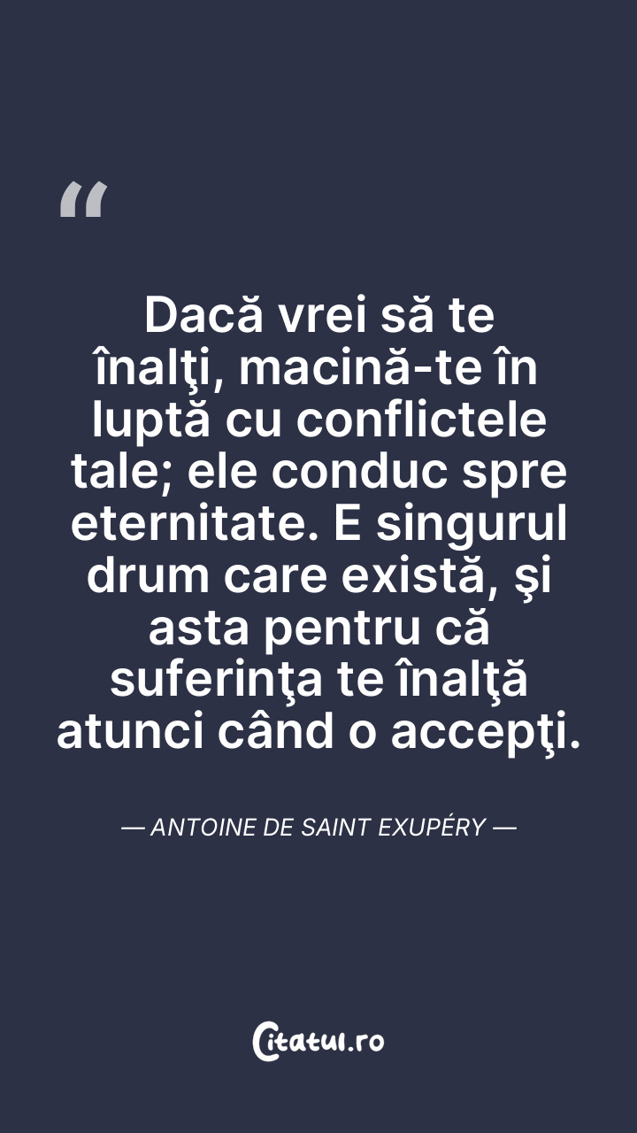 Dacă vrei să te înalţi, macină-te în luptă cu conflictele tale; ele conduc spre eternitate. E singurul drum care există, şi asta pentru că suferinţa te înalţă atunci când o accepţi. Antoine de Saint Exupéry