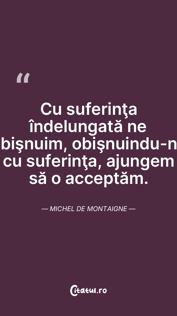 Cu suferinţa îndelungată ne obişnuim, obişnuindu-ne cu suferinţa, ajungem să o acceptăm. Michel de Montaigne