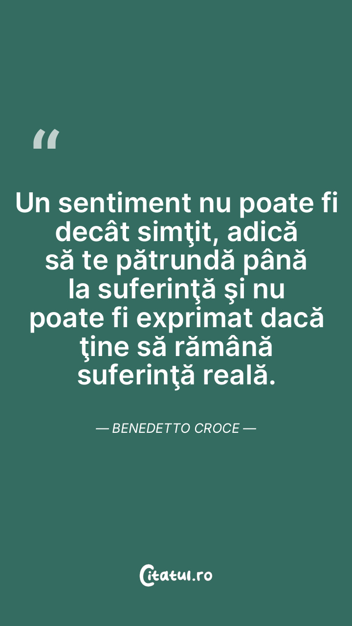 Un sentiment nu poate fi decât simţit, adică să te pătrundă până la suferinţă şi nu poate fi exprimat dacă ţine să rămână suferinţă reală. Benedetto Croce