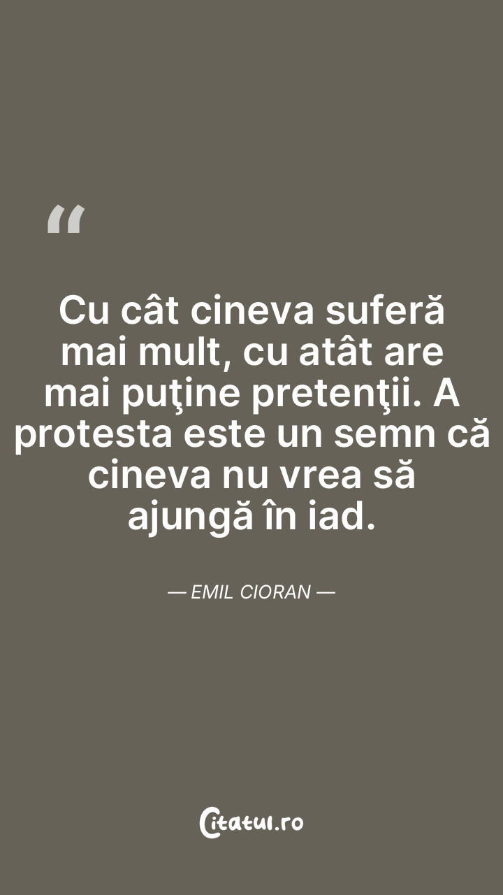 Cu cât cineva suferă mai mult, cu atât are mai puţine pretenţii. A protesta este un semn că cineva nu vrea să ajungă în iad. Emil Cioran
