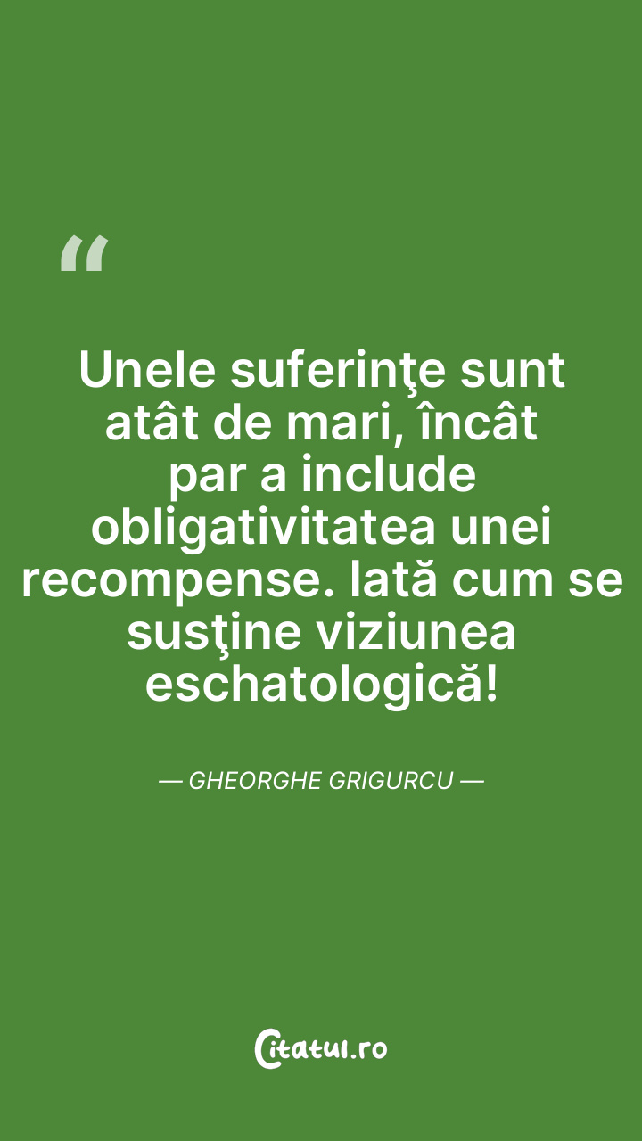 Unele suferinţe sunt atât de mari, încât par a include obligativitatea unei recompense. Iată cum se susţine viziunea eschatologică! Gheorghe Grigurcu