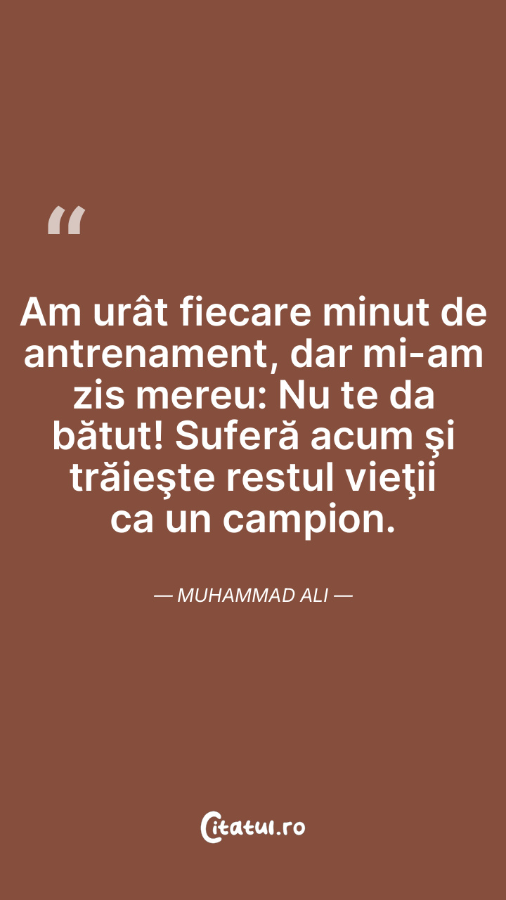 Am urât fiecare minut de antrenament, dar mi-am zis mereu: Nu te da bătut! Suferă acum şi trăieşte restul vieţii ca un campion. Muhammad Ali