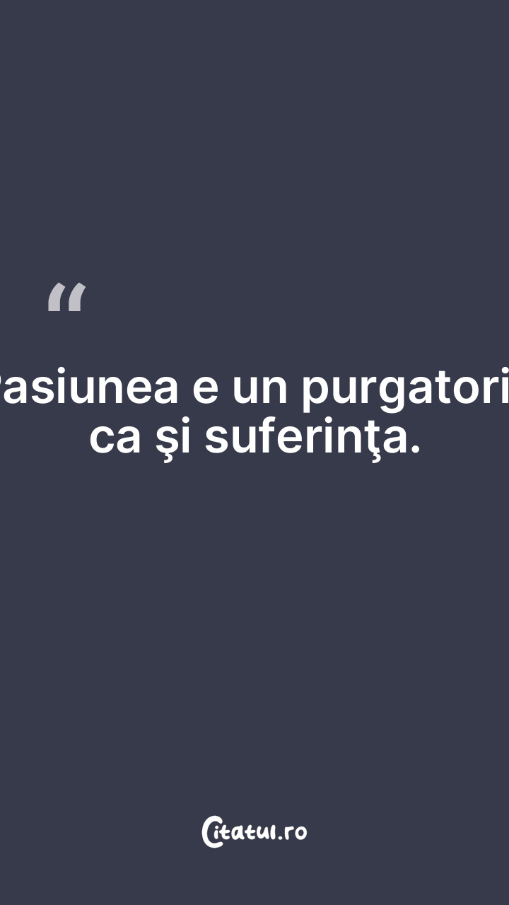 Pasiunea e un purgatoriu ca şi suferinţa. ... Categorie: citate triste Dificultate: Ușor de citit și înțeles Votează: ★ ★ ★ ★ ★ (0/5 din 0) Distribuiți acest citat? Alegeți platforma preferată: Salvează citatul in telefon/pc Pasiunea e un purgatoriu ca şi suferinţa. Copiază Favorite Eroare