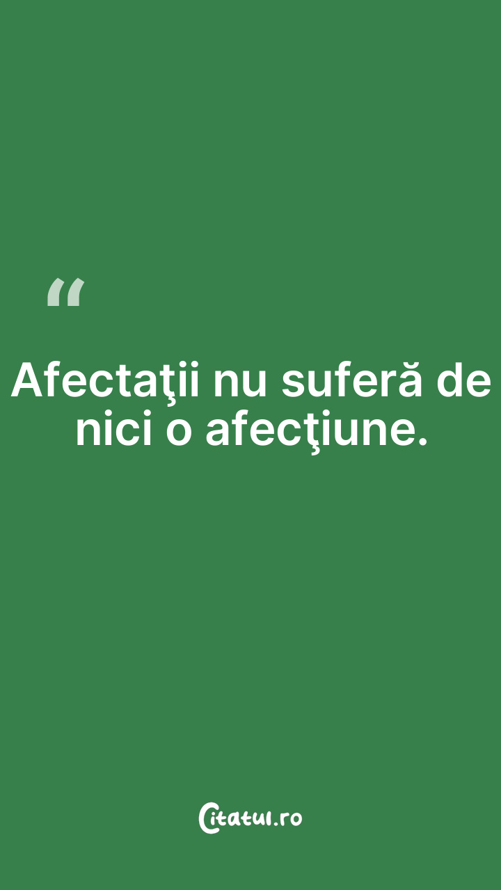 Afectaţii nu suferă de nici o afecţiune. ... Categorie: citate triste Dificultate: Ușor de citit și înțeles Votează: ★ ★ ★ ★ ★ (0/5 din 0) Distribuiți acest citat? Alegeți platforma preferată: Salvează citatul in telefon/pc Afectaţii nu suferă de nici o afecţiune. Copiază Favorite Eroare