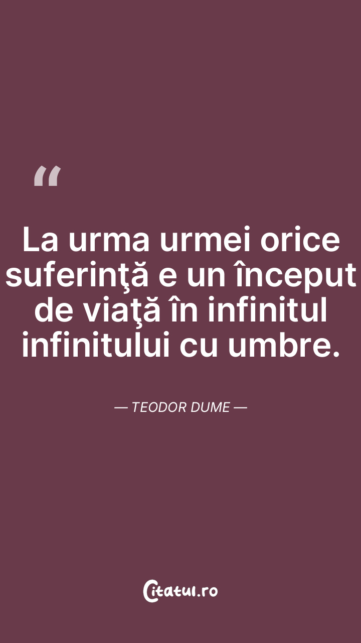 La urma urmei orice suferinţă e un început de viaţă în infinitul infinitului cu umbre. Teodor Dume