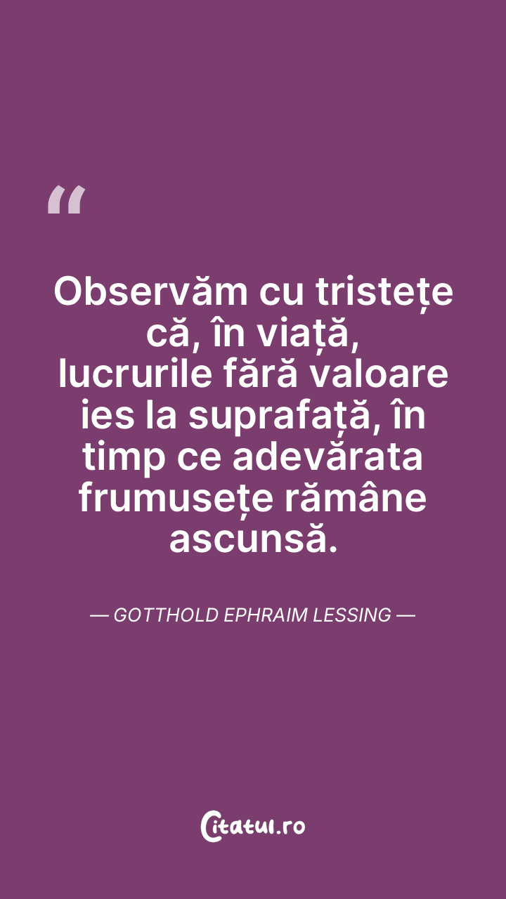 Observăm cu tristețe că, în viață, lucrurile fără valoare ies la suprafață, în timp ce adevărata frumusețe rămâne ascunsă. Gotthold Ephraim Lessing