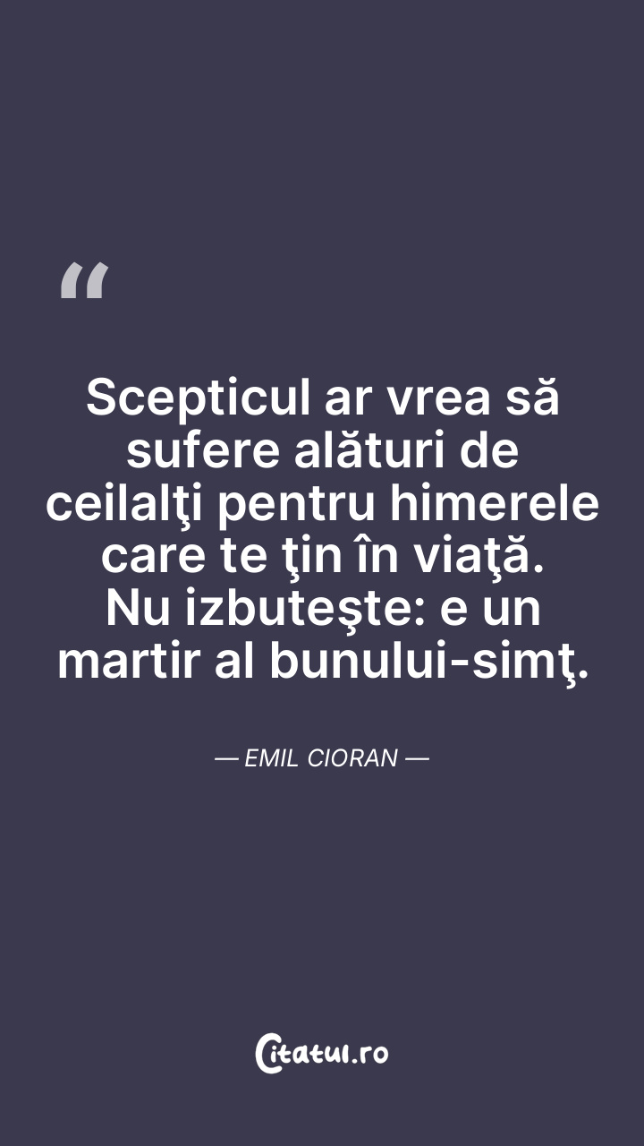 Scepticul ar vrea să sufere alături de ceilalţi pentru himerele care te ţin în viaţă. Nu izbuteşte: e un martir al bunului-simţ. Emil Cioran