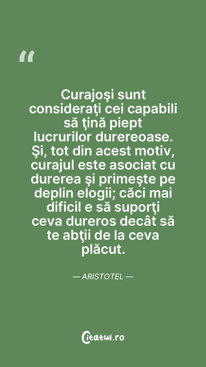 Curajoşi sunt consideraţi cei capabili să ţină piept lucrurilor durereoase. Şi, tot din acest motiv, curajul este asociat cu durerea şi primeşte pe deplin elogii; căci mai dificil e să suporţi ceva dureros decât să te abţii de la ceva plăcut. Aristotel