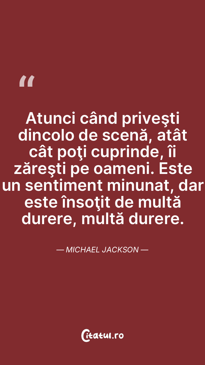 Atunci când priveşti dincolo de scenă, atât cât poţi cuprinde, îi zăreşti pe oameni. Este un sentiment minunat, dar este însoţit de multă durere, multă durere. Michael Jackson