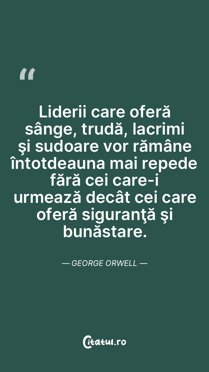 Liderii care oferă sânge, trudă, lacrimi şi sudoare vor rămâne întotdeauna mai repede fără cei care-i urmează decât cei care oferă siguranţă şi bunăstare. George Orwell